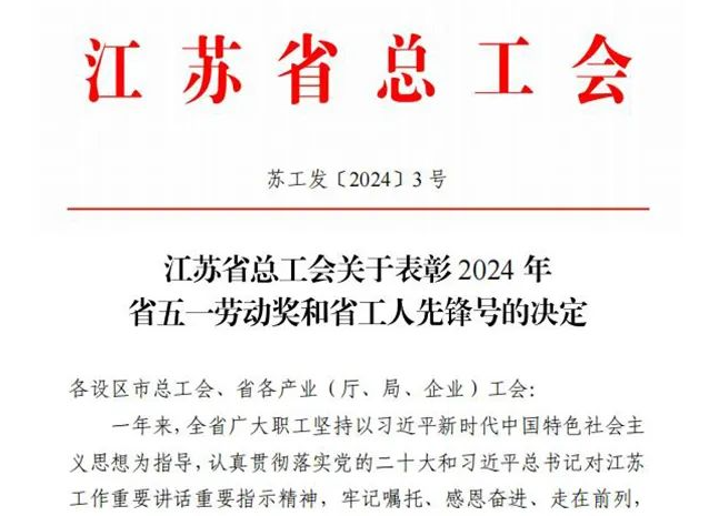 榮譽(yù):母公司獲評(píng)江蘇省五一勞動(dòng)獎(jiǎng)狀