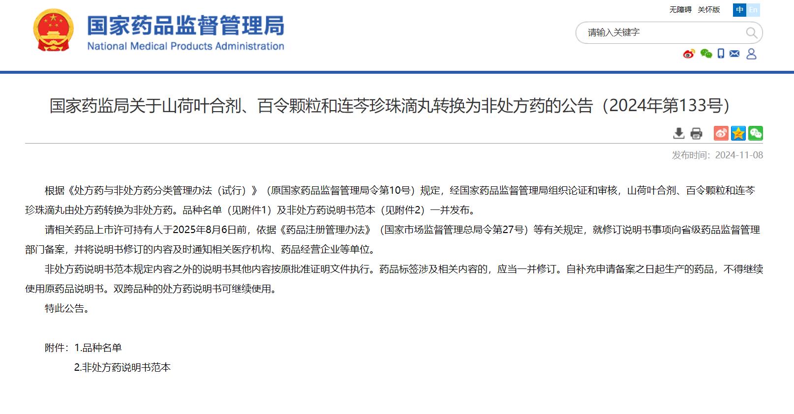 11月8日,國(guó)家藥品監(jiān)督管理總局發(fā)布2024年第133號(hào)公告,根據(jù)《處方藥與非處方藥分類(lèi)管理辦法(試行)》(原國(guó)家藥品監(jiān)督管理局令第10號(hào))規(guī)定,經(jīng)國(guó)家藥品監(jiān)督管理局組織論證和審核,公司下屬江蘇吳中醫(yī)藥集團(tuán)有限公司蘇州制藥廠生產(chǎn)的連芩珍珠滴丸由處方藥轉(zhuǎn)換為非處方藥...