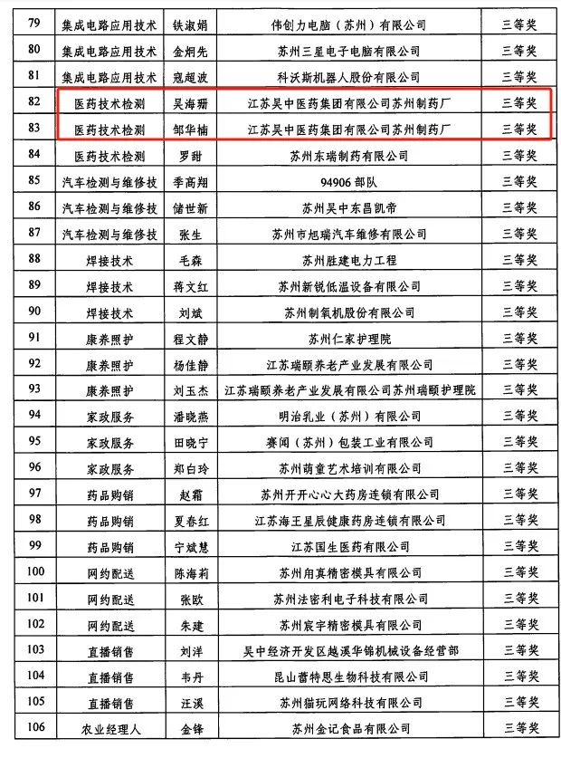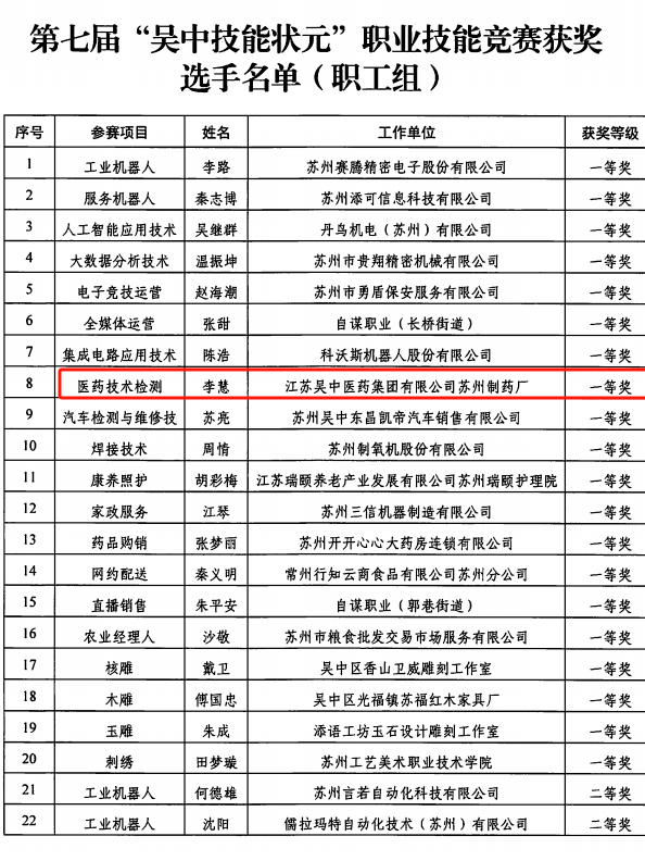 公司參賽選手嚴(yán)格遵守競賽規(guī)則,奮力拼搏,蘇州制藥廠質(zhì)量保障部李慧榮獲醫(yī)藥技術(shù)檢測一等獎(jiǎng),質(zhì)量保障部吳海珊和生產(chǎn)部鄒華楠榮獲醫(yī)藥技術(shù)檢測三等獎(jiǎng)。江蘇吳中醫(yī)藥集團(tuán)有限公司蘇州制藥廠榮獲“吳中區(qū)高技能人才培養(yǎng)貢獻(xiàn)獎(jiǎng)”。