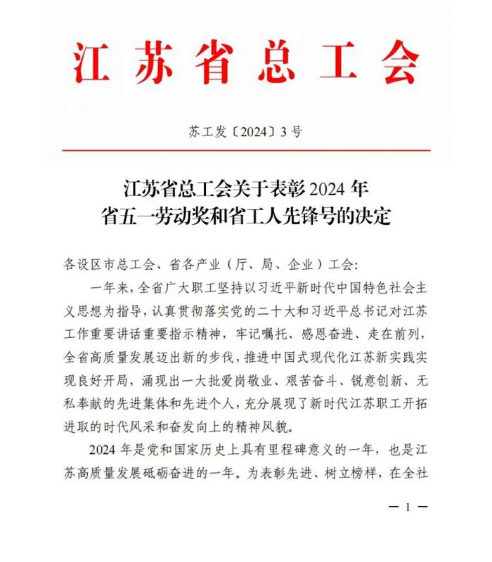 榮譽(yù):母公司獲評(píng)江蘇省五一勞動(dòng)獎(jiǎng)狀 日期:2024年4月23日