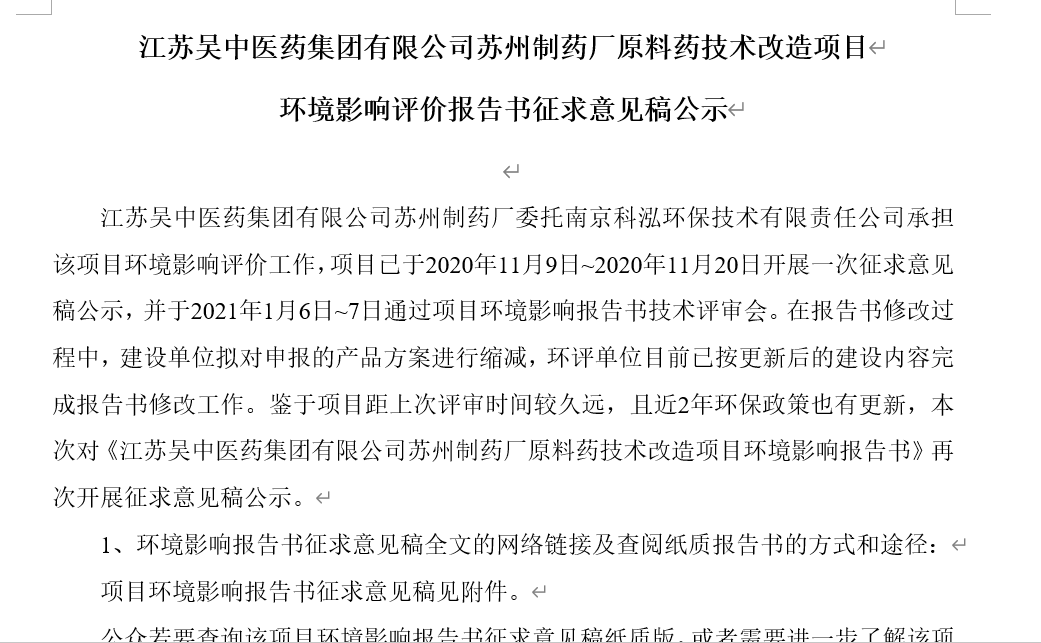 江蘇吳中醫藥集團有限公司蘇州制藥廠委托南京科泓環保技術有限責任公司承擔該項目環境影響評價工作,項目已于2020年11月9日~2020年11月20日開展一次征求意見稿公示,并于2021年1月6日~7日通過項目環境影響報告書技術評審會...