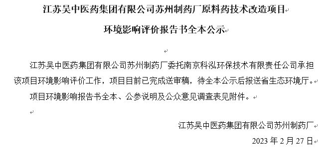 江蘇吳中醫藥集團有限公司蘇州制藥廠原料藥技術改造項目環境影響評價報告書征求意見稿公示