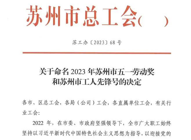 為表彰先進、樹立榜樣,在全社會弘揚勞模精神、勞動精神、工匠精神,培育時代新風新貌,蘇州市總工會在五一前夕表彰了一批積極投身疫情防控和經濟社會發展各項工作,為推動蘇州經濟社會高質量發展作出了積極貢獻,愛崗敬業、艱苦奮斗、銳意創新、無私奉獻的先進集體和先進個人...