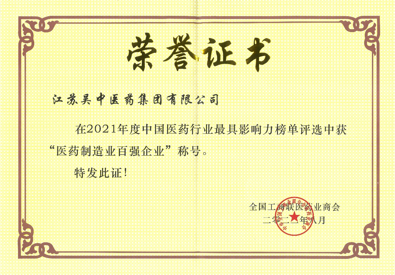 吳中醫藥喜獲全國醫藥商會醫藥制造業百強企業稱號